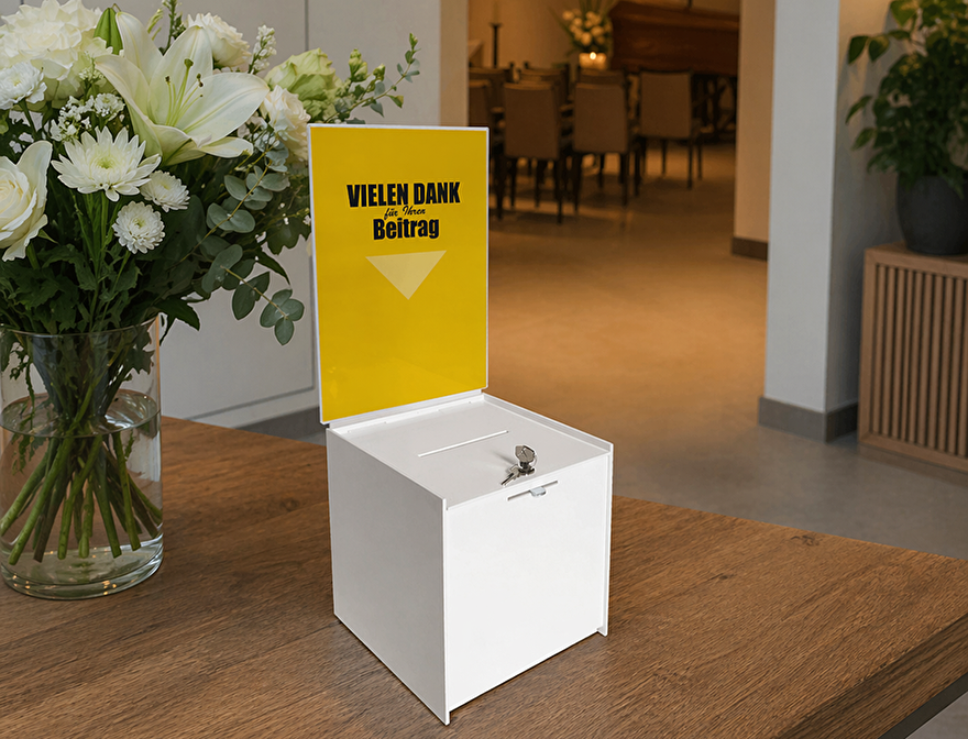Manche Bestattungsunternehmen stellen eine Sammelbox zur Verfügung, doch das ist nicht immer der Fall. In diesem Fall kann man selbst eine geeignete Spendenbox organisieren. Empfehlenswert ist ein abschließbares Modell, damit das gesammelte Geld sicher verwahrt ist.